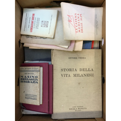Lotto composto da numerose pubblicazioni, per la maggior parte illustrate, inerenti la storia locale della Lombardia e della Liguria, fra cui ad esempio: - BOSELLI, Paolo. Discorsi e scritti. Torino: Baravalle e Falconieri, 1915-19 (4 voll.); - FRIGERIO, Federico. Il Duomo di Como e il Broletto. Como: Cesare Nani, 1950; - MAGISTRETTI, Marco. Delle vesti ecclesiastiche in Milano. Milano: Casa Editrice L.F. Cogliati, 1905 (II edizione accresciuta); - VERGA, Ettore. Storia della vita milanese. Milano: Nicola Moneta, 1931. In due cartoni (lievi difetti).