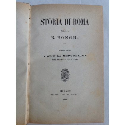 BONGHI, Ruggiero. Storia di Roma. Milano: Treves, 1884. Volume in 8vo (fioriture e bruniture). Legatura in mezza pergamena con decori in oro al dorso.