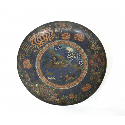 Grande piatto in metallo cloisonné con figure di battaglia (difetti) Giappone, sec. XX (d. 54 cm.)