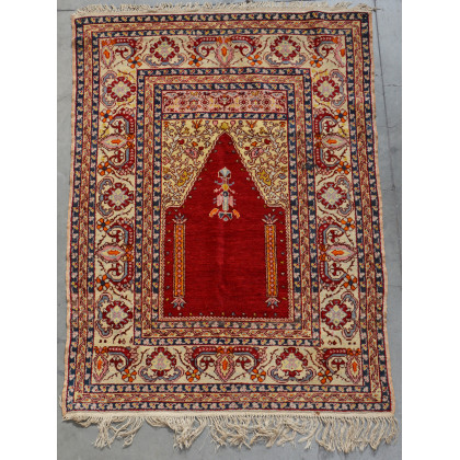 [Tappeti] Tappeto Ghiordes, Anatolia, secolo XX. Disegno a preghiera con mirab su fondo rosso con lampada votiva. Grande bordura a testuggine su fondo bianco (cm 170x119) (difetti)