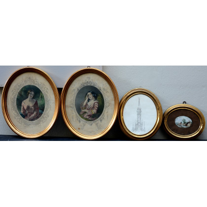 Gruppo di quattro cornici ovali dorate, contenenti stampe e miniature, misure diverse