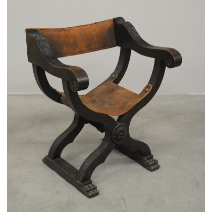 Sedia in legno tinto scuro con intagli a foglie di acànto e zampe ferine, seduta e dorsale in cuoio borchiato; ultimo quarto del secolo XIX (difetti)