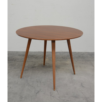 Tavolo tondo in legno a quattro gambe troncoconiche, anni '50-60 (d cm 100x h cm 75)(difetti)