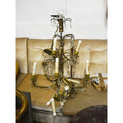 Lampadario a otto fiamme su due ordini diversi, in ottone con bracci ricurvi e gocce in vetro (gravi difetti)