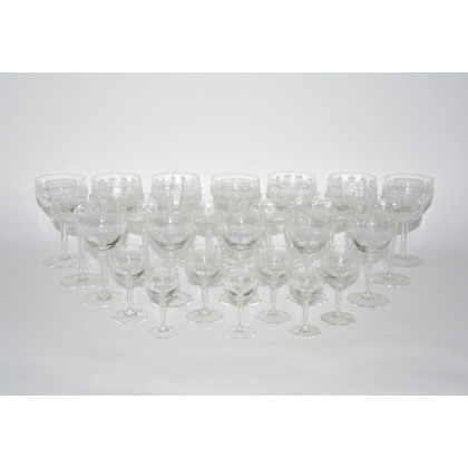 Parte di servizio di bicchieri in cristallo con fascia a decoro floreale inciso, composto da dieci coppe da champagne, dieci calici per acqua e dieci per vino, nove calici da liquore e undici da grappa (difetti)