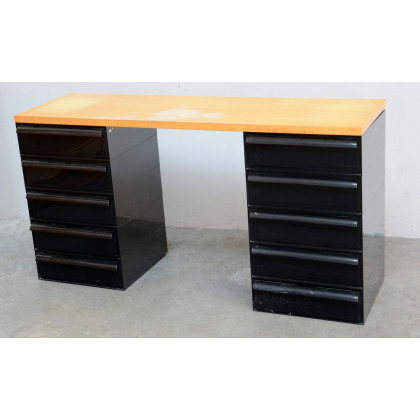 Scrivania modello "4601 3-5". Produzione Kartell, anni 70. Struttura in plastica a due colonne con cinque cassetti, piano impiallacciato in legno chiaro (cm 140x73x43) (lievi difetti)