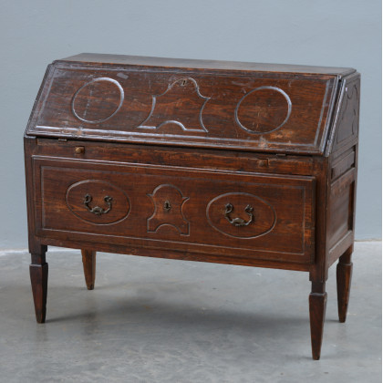 Ribalta rustica con cassetto e anta ribaltabile celante quattro cassettini e vano, piedi rastremati (cm 107x92x44) (difetti)