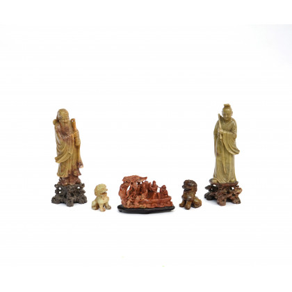 Gruppo di sculture in pietra dura (due cani di Fo, due figure e un gruppo con base in legno Cina, sec. XX (h. max 27 cm.)