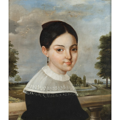 Ignoto, sec. XIX "Fanciulla in un paesaggio" olio su tela (cm 47,5x42) Siglato e datato C. 1837 in basso a sinistra. In cornice (difetti e restauri)