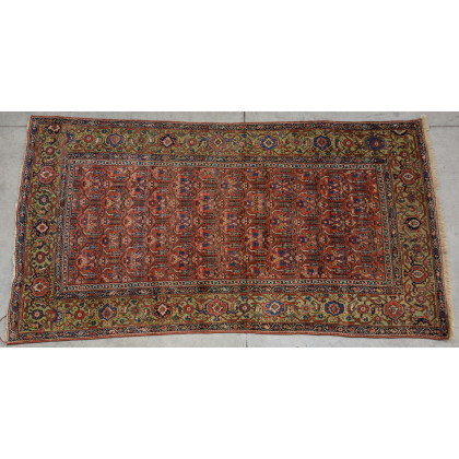 [Tappeti] Tappeto Ferahkhan, Persia, fine secolo XIX. Disegno a giardino nei toni dell'azzurro, bianco e giallo su fondo rosso. Bordura Herati su fondo verde. (cm 199x103) (difetti)