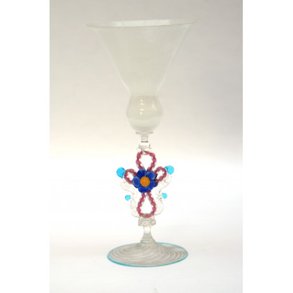 Manifattura di Murano del secolo XX grande bicchiere in vetro soffiato decorato con striature bianche e applicazioni a fiori in pasta di vetro (h cm 29,5)