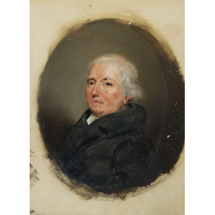 Ignoto "Ritratto di uomo con cappotto nero" olio su cartone pressato (cm 21x15) In cornice in legno e pastiglia dorata (difetti)