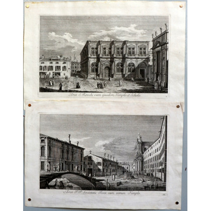 VISENTINI, Antonio - Coppia di incisioni (350 x 520 circa) con acquaforte: Area S Rocchi cum ejusdem Templo et Scola, V. e Area P. P. Societatis Jesu cum corum Templo, IX. (bruniture, macchie, specie ai bordi)