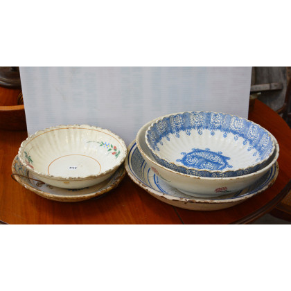 Lotto composto da cinque contenitori in terraglia dipinta di manifatture ed epoche differenti (d max cm 41) (difetti e mancanze)