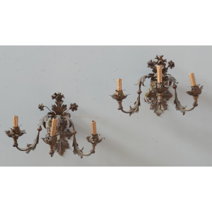 Coppia di appliques a tre fiamme in ferro battuto a fiori e foglie (h cm 40)(difetti)