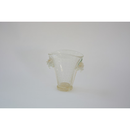 Manifattura di Murano. Vaso biansato decorato con fiori in rilievo, inclusione di bolle d'aria e applicazione di foglia d'oro. Anni 40/50 (h cm 25)