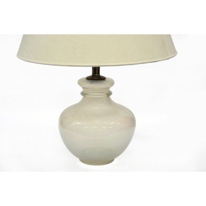 Manifattura di Murano. Lampada con base in vetro soffiato incolore iridato sulla superficie esterna e con paralume in stoffa. Anni 60-70