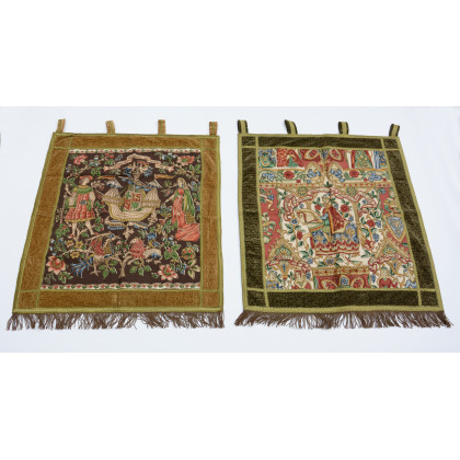[Tappeti] Due piccoli arazzi in cotone stampato con motivi cavallereschi bordati in velluto e decorati con filo metallico, secolo XX. (cm 70x80) (difetti)