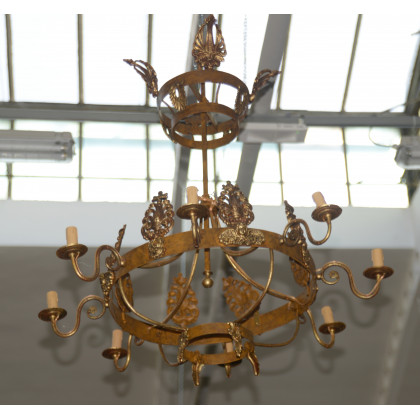 Lampadario a otto luci in ferro battuto e dorato intervallate da mascheroni e fregi a motivi fogliati (h. cm 100) (difetti)
