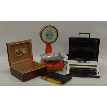 Lotto composto da una bilancia da cucina, un deumidificatore per sigari, una macchina da scrivere Singer e una lampada Beghelli (difetti)