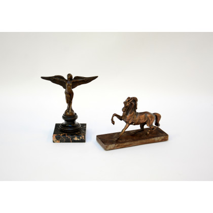 Lotto di due piccole sculture in bronzo raffiguranti un cavallo e una donna alata (h max cm 21) (difetti)