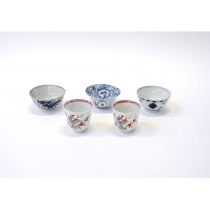 Manifattura di Cina. Cinque ciotole e tazze in porcellana policroma con decori e misure diverse. Sec. XVIII e XIX (difetti e restauri)