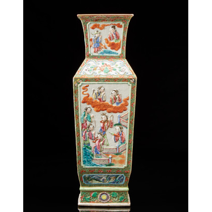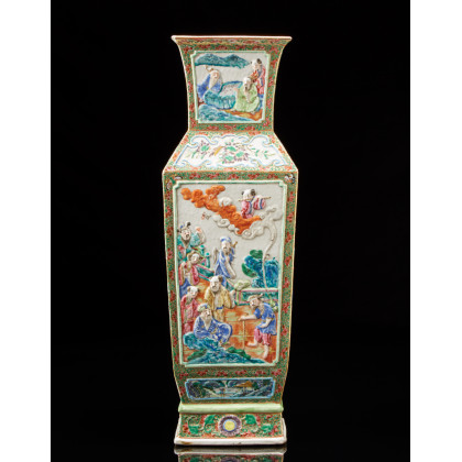 Vaso di forma quadrata in porcellana Famiglia Verde decorato con oggetti preziosi (difetti e restauri) Cina, sec. XIX A squared-shaped Famille Verte vase decorated with precious objects (losses and restoration) China, 19th century (h. 60 cm.)
