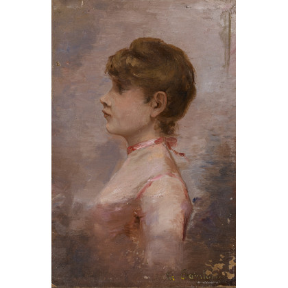 "Ritratto di giovane ragazza di profilo" olio su cartone pressato (cm 23x15) Firmato in basso a destra. In cornice (difetti)