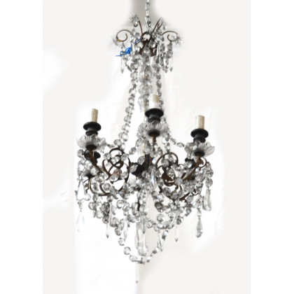 Lampadario a sei fiamme in metallo con perlinature e asta in vetro (h. cm 80) (difetti e mancanze)
