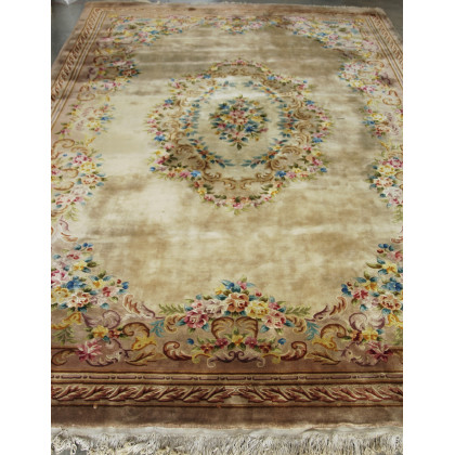 Grande tappeto Cina a fondo beige decorato a motivi floreali policromi sparsi e medaglione centrale. Inizio sec. XX (cm 546x358) (difetti)