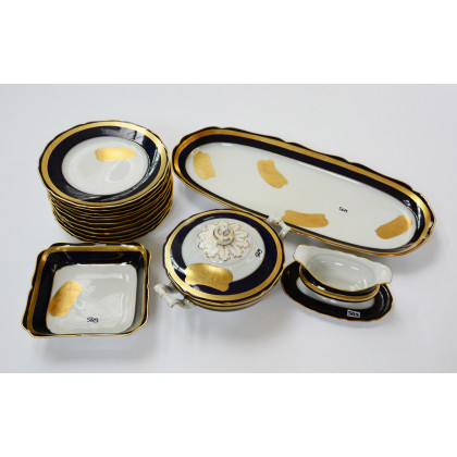 Servizio di piatti composto da 11 piatti piani, un vassoio, una zuppiera, una salsiera, una ciotola in porcellana blu e oro (difetti)