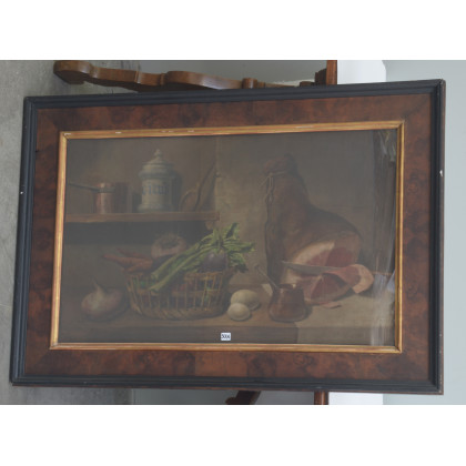 Maestro del secolo XIX, "Natura morta con prosciutto e cesto di verdure" olio su tela (cm 53x84) in cornice (difetti e restauri)