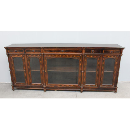 Mobile vetrina in legno a tinta scura intarsiato e filettato con cinque ante divise da colonnine e decorato da fioroni intagliati (cm 240x102x45) (lievi difetti)