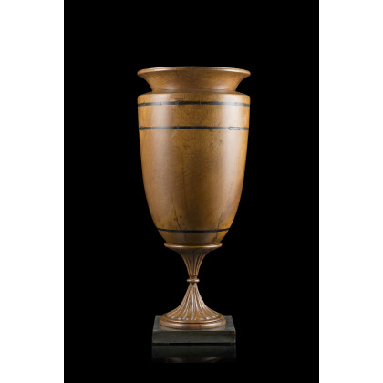 Vaso in ciliegio tornito con filetti in legno ebanizzato poggiante su piede intagliato a motivi concatenati. Base quadrata in marmo (h. cm 50) (difetti e restauri)