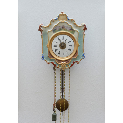 ANONIMO Orologio foresta nera, quadrante in ceramica decorato con castello e casetta, quadrante con numeri romani, movimento con carica giornaliera (h cm 25) (difetti)