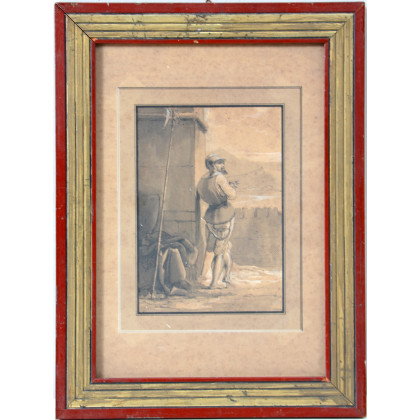 Scuola del secolo XIX, "Soldato a riposo" tecnica mista su carta (cm 19x13) in cornice (difetti)