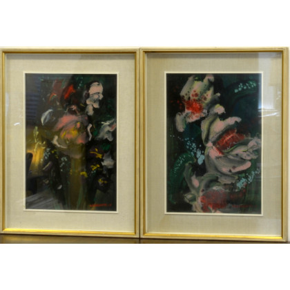 Coppia di dipinti ad olio su cartone raffiguranti fiori (cm 50x36), in cornici (lievi difetti)