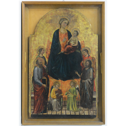 Ignoto, "Madonna in trono con Bambino, santi e angeli" tavola a fondo oro (82x51,5 cm). In teca (restauri)