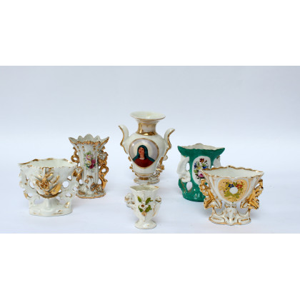 Manifattura francese del secolo XIX, lotto di sette piccoli vasetti portafiori in porcellana decorata in policromia a fiori, volto di donna e fregi dorati, misure diverse (difetti)