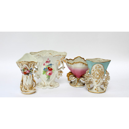 Manifattura francese del secolo XIX, lotto di quattro vasetti portafiori in porcellana decorata in policromia a fiori e fregi dorati, misure diverse (difetti)