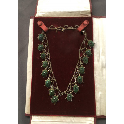 Collier in argento rifinito con smalto verde su tartarughe pendenti, distanziate tra loro da microperle bianche. In confenzione Giuseppe Villa (difetti)
