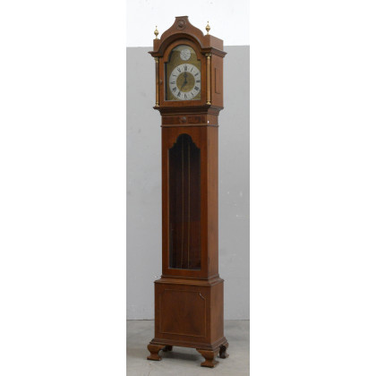 Pendola a torre in legno, quadrante a fascia con numeri romani, movimento con carica settimanale, suoneria delle ore e delle mezze. Anni '50/'60 circa (cm 38x206x26)