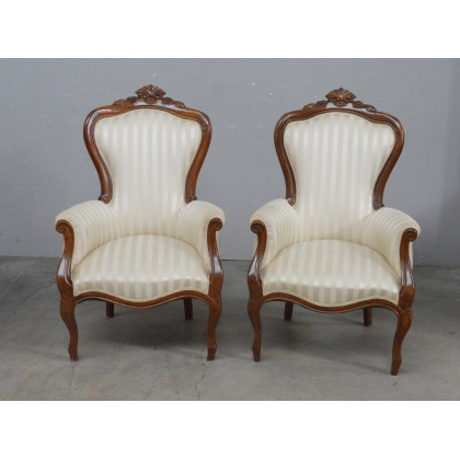 Coppia di poltrone con struttura mossa in noce intagliato con imbottitura rivestita in tessuto a righe color champagne (difetti)