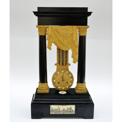 Pendola a due colonne in legno ebanizzato decorata con capitelli e fregi in bronzo dorato, movimento e quadrante sospesi, carica settimanale (cm 33x57x15) (difetti)