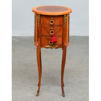 Comodino a cilindro lastronato e filettato, tre cassett e gambe mosse (d cm 31, h cm 68) (difetti)