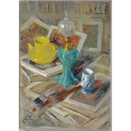 "Oggetti nello studio" 1969, olio su tela (cm 70x50)firmato e locato in basso a sinistra. Firmato, locato, datato e titolato al retro.