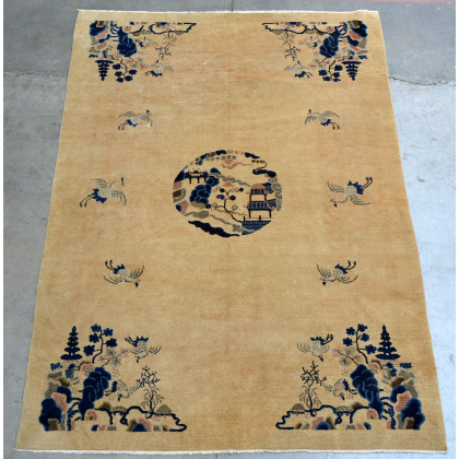 Tappeto Pechino, Cina secolo XX Disegno pittorico con pagode, giardini e cicogne in volo su fondo color albicocca (cm 266x187)(difetti)