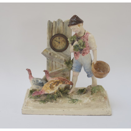 Gruppo in ceramica policroma raffigurante un ragazzo con tacchini davanti a una staccionata nella quale è inserito un piccolo orologio (h cm 30) (difetti e restauri)