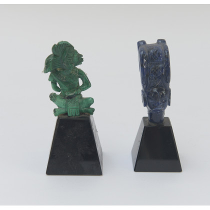Lotto di due sculture in pietra dura in stile precolombiano, con base (difetti e mancanze) (h. max 8,5 cm.)