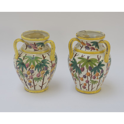 Manifattura del centro Italia, coppia di anfore a tre anse in ceramica policromia con decori a graffito raffiguranti rami con frutti (h cm 24) (difetti)